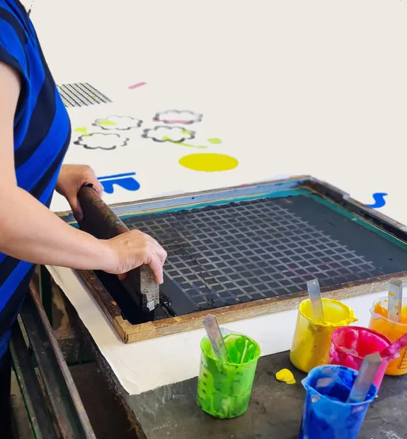 Workshop prático com apoio teórico: os participantes aprenderão as técnicas de estamparia e aplicarão os conhecimentos num ambiente prático, com acompanhamento individualizado durante o processo.